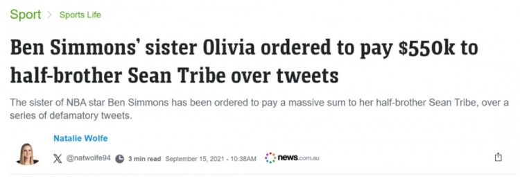奥利维亚嘲讽弟弟可以不了了之,但说哥哥性侵犯就是大事儿,就在西蒙斯打季后赛那段时间,肖恩把她告到法院。手心手背都是肉,西蒙斯很痛苦,只能和他的队友说感谢你们的支持,拜托你们别说了。